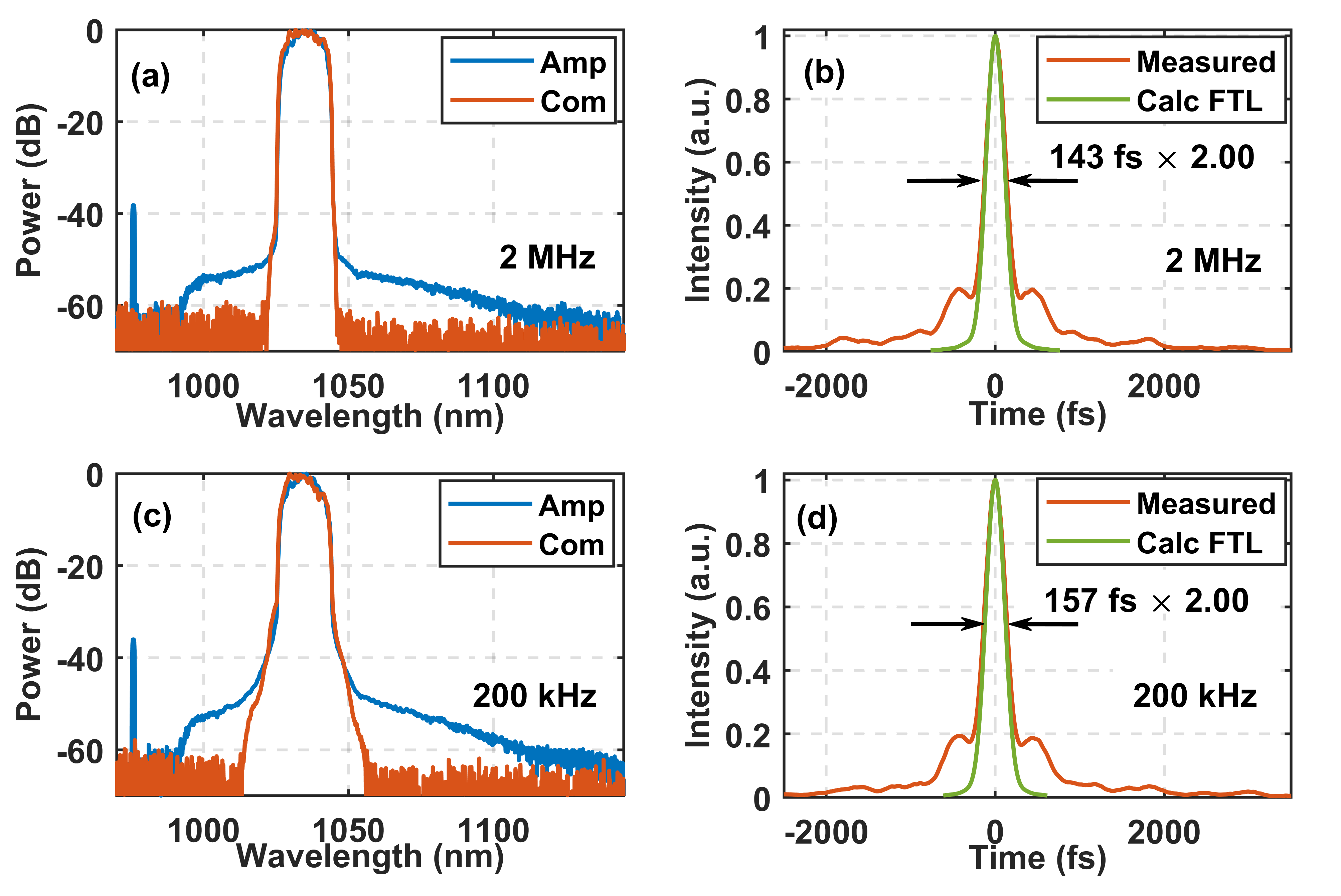图 1.输出脉冲的特性。(a)2 MHz:功率放大器(蓝色曲线)和脉冲压缩器(橙色曲线)的输出光谱。(b)2 MHz:输出脉冲自相关迹(橙色曲线)和 依据光谱计算的傅里叶变换极限(FTL)自相关迹(浅绿色曲线)(c)200 kHz:功率放大器(蓝色曲线)和脉冲压缩器(橙色曲线)的输出光谱。(d)200 kHz:输出脉冲自相关迹(橙色曲线)和 FTL自相关迹(浅绿色曲线)
