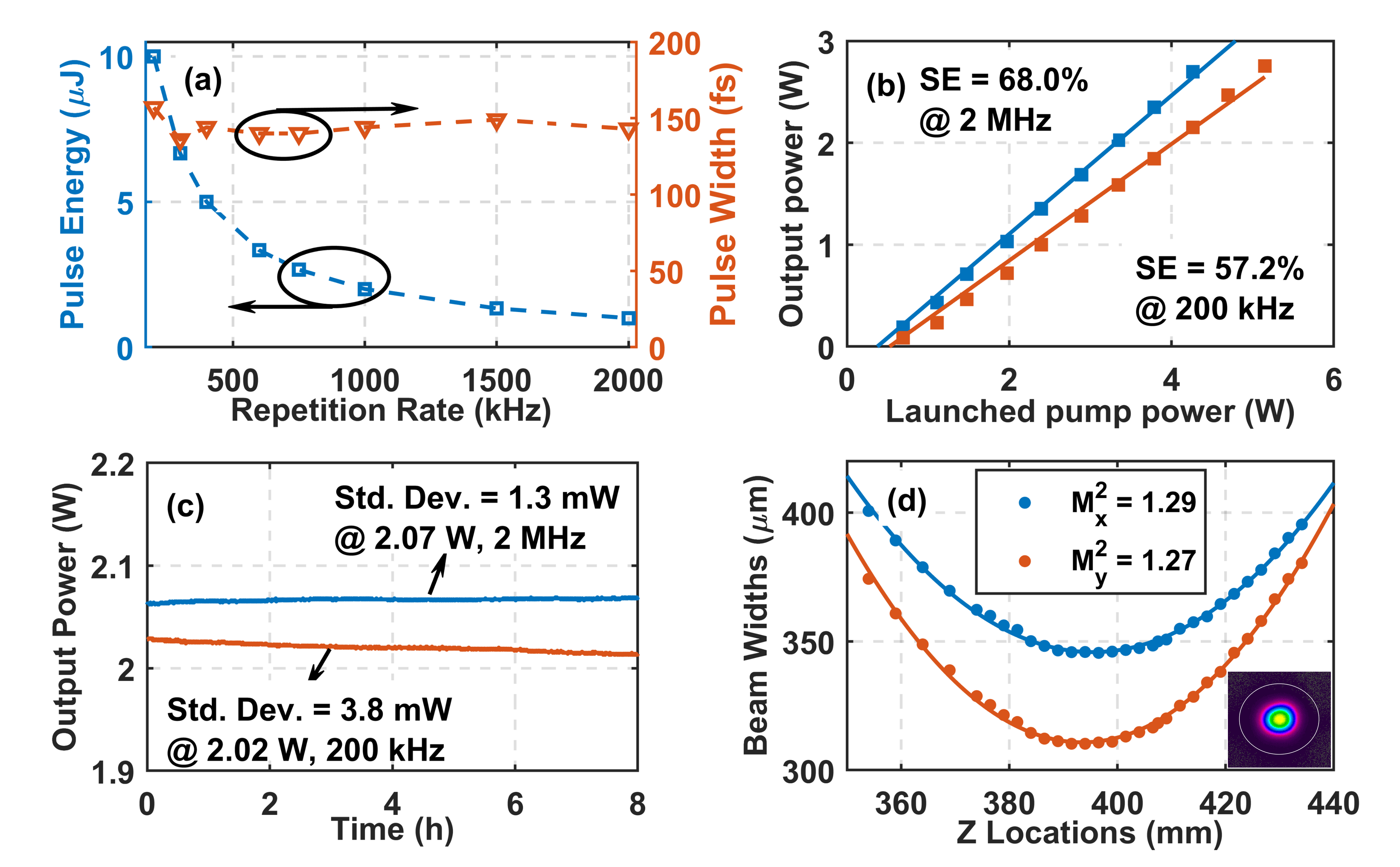 图 2.(a)对应重复频率的脉冲能量(蓝色方块)和脉冲宽度(橙色三角形)。(b)光纤放大器在2 MHz(蓝色实心方块)和 200 kHz(橙色实心方块)重复频率下的放大斜效率(SE)。(c)在 2 MHz(蓝线)和 200 kHz(橙线)重复频率下的输出平均功率稳定性。(d)压缩脉冲在x和y方向的M2测量值 (10 μJ)。插图:输出光斑轮廓。