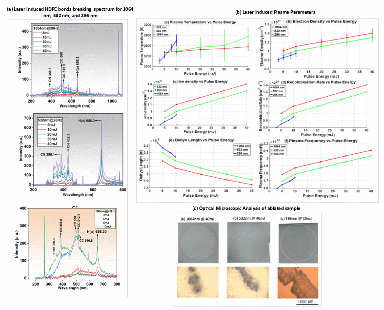 在这项工作中,研究人员采用了三种激光谐波,即1064 nm、532 nm和266 nm,以探究不同激光参数对高密度聚乙烯(HDPE)键断裂的影响,并确定引发化学反应所需的能量阈值。研究结果显示,在HDPE中引发反应所需的阈值脉冲能量随波长显著变化:1064 nm时为5-10 mJ,532 nm时为3-5 mJ,266 nm时为1-3 mJ。这种变化归因于与各波长相关的不同光子能量,例如,1064 nm时约为1.17 eV,266 nm时约为4.66 eV这直接影响它们断裂特定分子键的能力,如图1(a)所示。这些结果证实,在激光诱导热解的背景下,每种激光波长都需要不同的阈值能量来断裂HDPE键。整体等离子体诊断结果表明,在键断裂过程中能量传递效率较高,且其他参数也支持这一观点,如下图1(b)所示。烧蚀部位的显微成像进一步证实,266 nm 辐照下实现了局部、干净的烧蚀,而 1064 nm 和 532 nm 激光下观察到的损伤则更为广泛且模糊,如下图1(c)所示。本研究为激光热解实现可持续塑料回收开辟了新途径,有望实现更清洁、更精确的处理工艺。