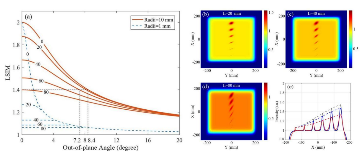 图1仿真结果:(a)在不同的光栅对间距改变量下,LSIM和面外角关系曲线。红色实线代表半径为10 mm的热点,蓝色虚线代表半径1 mm的热点。图(b)-(d)为从DSGC出射的脉冲光斑分布。光栅间距改变量分别为L=20,40和80 mm,面外角固定为5°。在Y=0 mm处沿X方向的强度分布如图(e)所示。黑色、蓝色和红色线分别表示L=20、40和80 mm的情况。