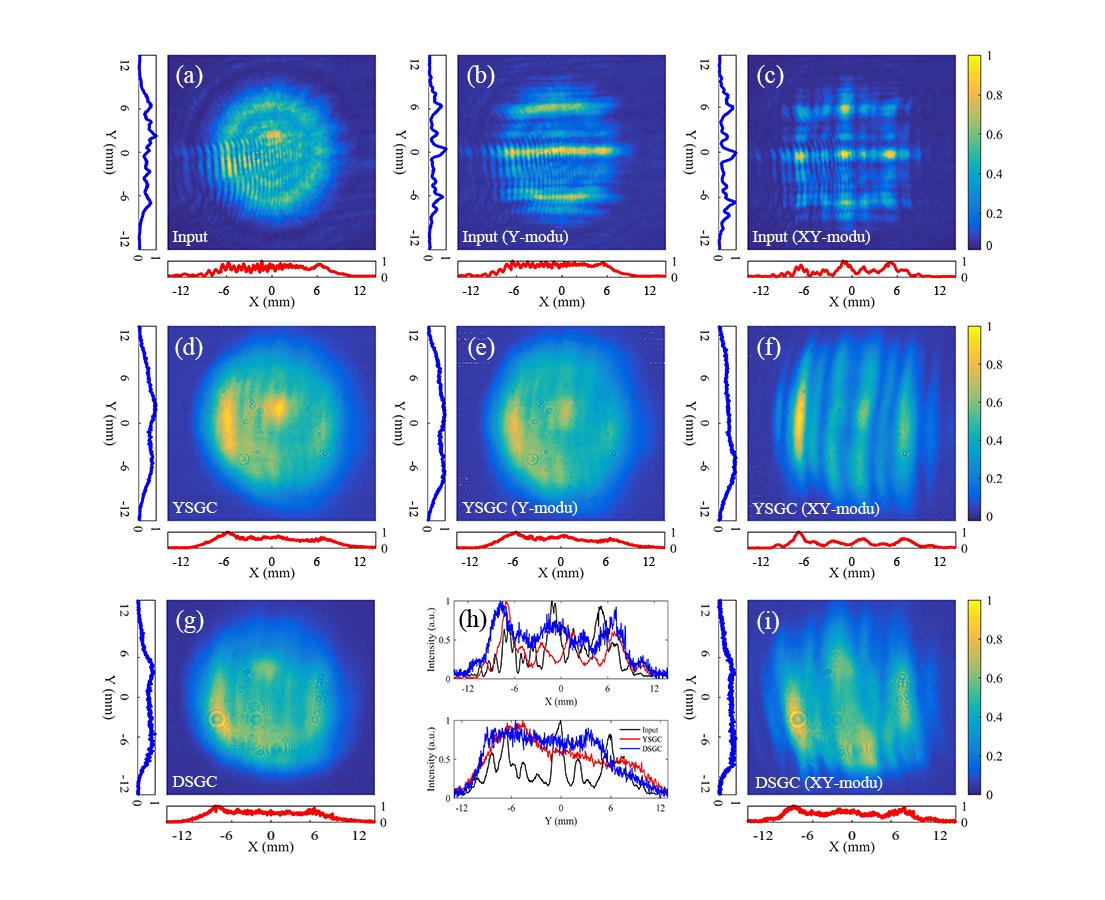图2实验结果:(a)-(c)分别为未进行调制的入射脉冲、仅加入纵向调制的入射脉冲和加入纵向、横向调制的入射脉冲光斑。(d)-(f)分别为(a)-(c)对应的面外压缩器(YSGC:引入了纵向空间色散)的出射光斑。(g)和(i)分别为(a)和(c)对应的DSGC的出射光斑。(h)为(c)、(f)和(i)在Y=0处沿X方向和在X=0处沿Y方向的强度分布。