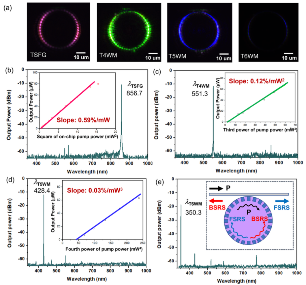 图1. 横向多波混频过程。(a)微腔上不同横向非线性光信号发射的光学显微图,从左到右分别对应和频、四波混频、五波混频和六波混频过程。(b)和频信号光谱图。(c)四波混频信号光谱图。d)五波混频信号光谱图。(b)-(d)的各插图:相应非线性信号的输出功率与泵浦功率的关系。(e)六波混频信号光谱图。插图:在单个连续波(P)泵浦微盘腔时,由背向和前向SRS信号(即BSRS和FSRS)形成的光折变光栅示意图。
