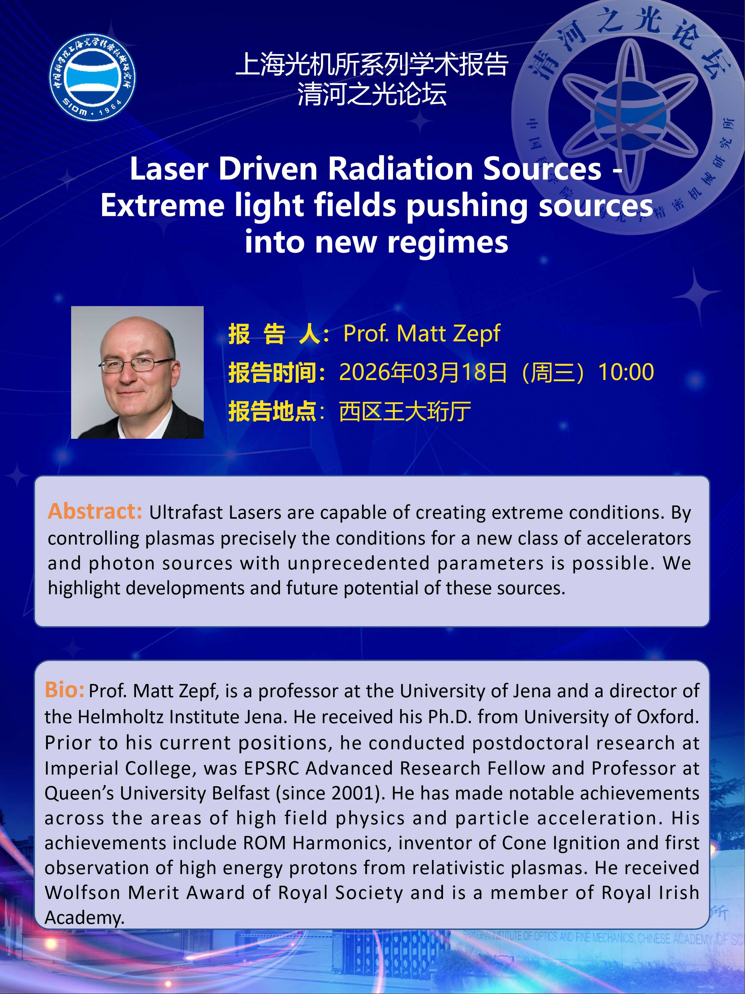 Prof. Matt Zepf, is a professor at the University of Jena and a director of the Helmholtz Institute Jena. He received his Ph.D. from University of Oxford. Prior to his current positions, he conducted postdoctoral research at Imperial College, was EPSRC Advanced Research Fellow and Professor at Queen’s University Belfast (since 2001). He has made notable achievements across the areas of high field physics and particle acceleration. His achievements include ROM Harmonics, inventor of Cone Ignition and first observation of high energy protons from relativistic plasmas. He received Wolfson Merit Award of Royal Society and is a member of Royal Irish Academy. |