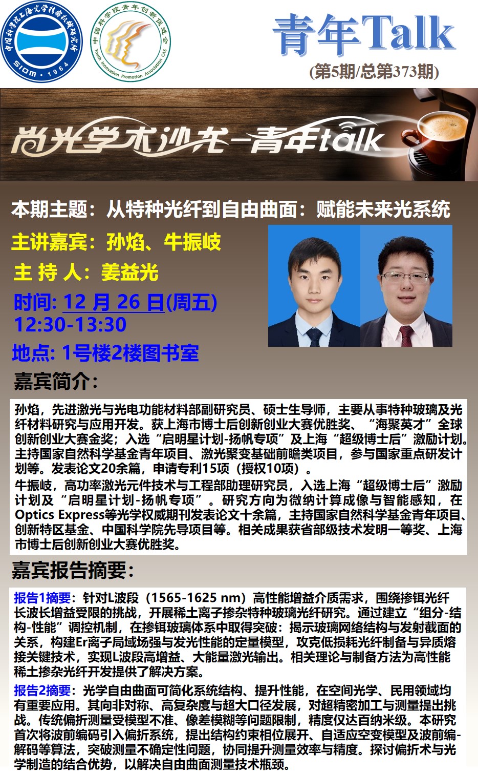 孙焰,先进激光与光电功能材料部副研究员、硕士生导师,主要从事特种玻璃及光纤材料研究与应用开发。获上海市博士后创新创业大赛优胜奖、“海聚英才”全球创新创业大赛金奖;入选“启明星计划-扬帆专项”及上海“超级博士后”激励计划。主持国家自然科学基金青年项目、激光聚变基础前瞻类项目,参与国家重点研发计划等。发表论文20余篇,申请专利15项(授权10项)。